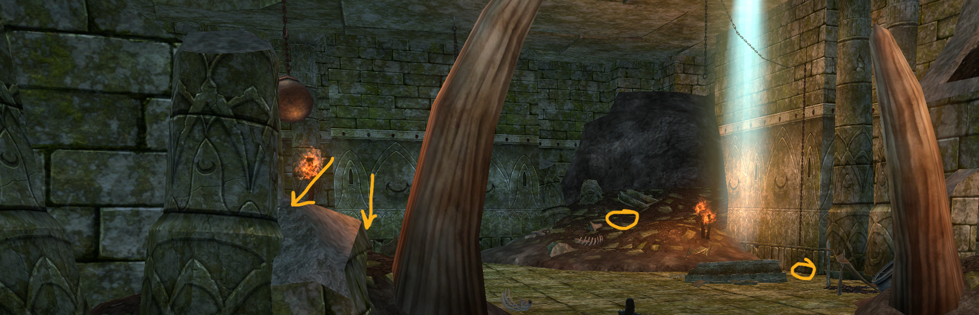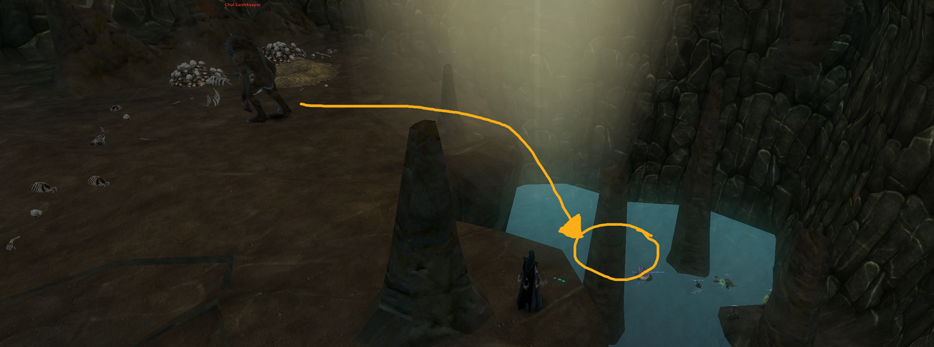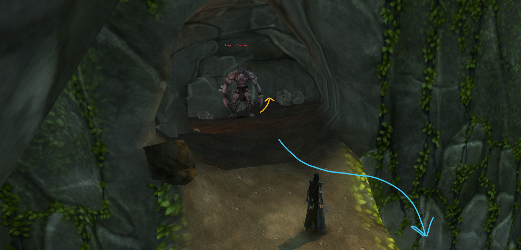 He will do an enraged charge, like the SH charge, that will knock back all players so it is recommended to tank him just behind where he stands in that cove so all the party stands together, see arrow in orange. This can be interrupted.