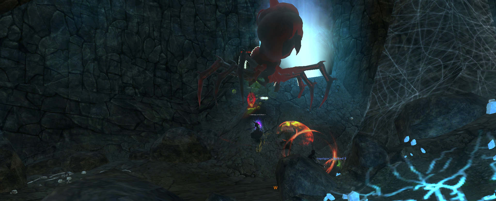 On the way to this boss you go through the spider cave and in the entrance to her lair there are Braziers that EVERYONE MUST click to get the Burn webbing ability. Every 20% health or so, everyone will be punted very fair and when they land, they will be stuck by webbing. Click this ability to free yourself and run back.