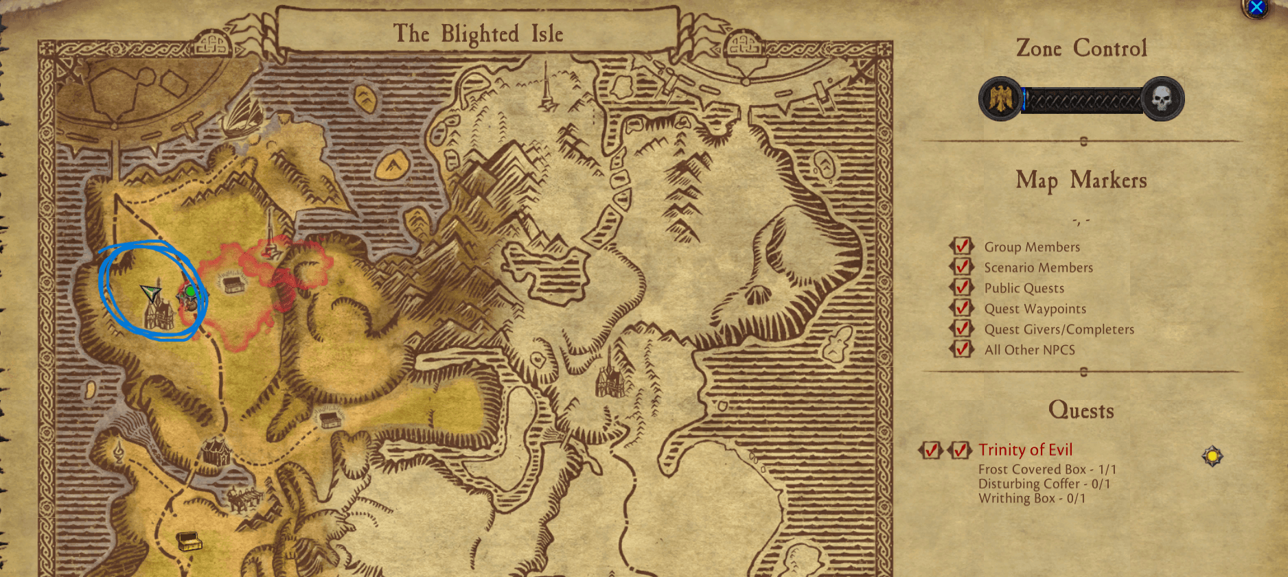 Then search the red area to find the Aged Plain Chest and Aged Battered Chest (inside a building down the stairs).