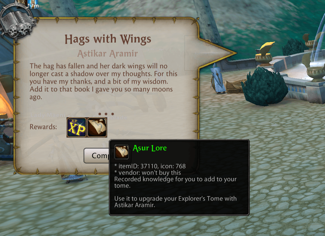 Run North to Chapter 13 to find Astikar Aramir, who is also the vendor for the book, and take the next part of the quest. First you will need to kill a Darkwing Lordling to get the Lordling hand. Then run back up to the PQ, and head West towards the cliffs behind the building to place it in the basket. Both these areas are marked on the map.